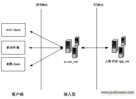 TRFA人脸认证服务的大体架构如上图所示,分为接入层和服务层。其中,接入层对外提供基于HTTP协议的服务接口,主要完成接入用户请求、登录认证、分配应用服务器、返回结果等功能;服务层提供具体的识别服务,完成单纯的计算任务,并把结果返回给接入层。