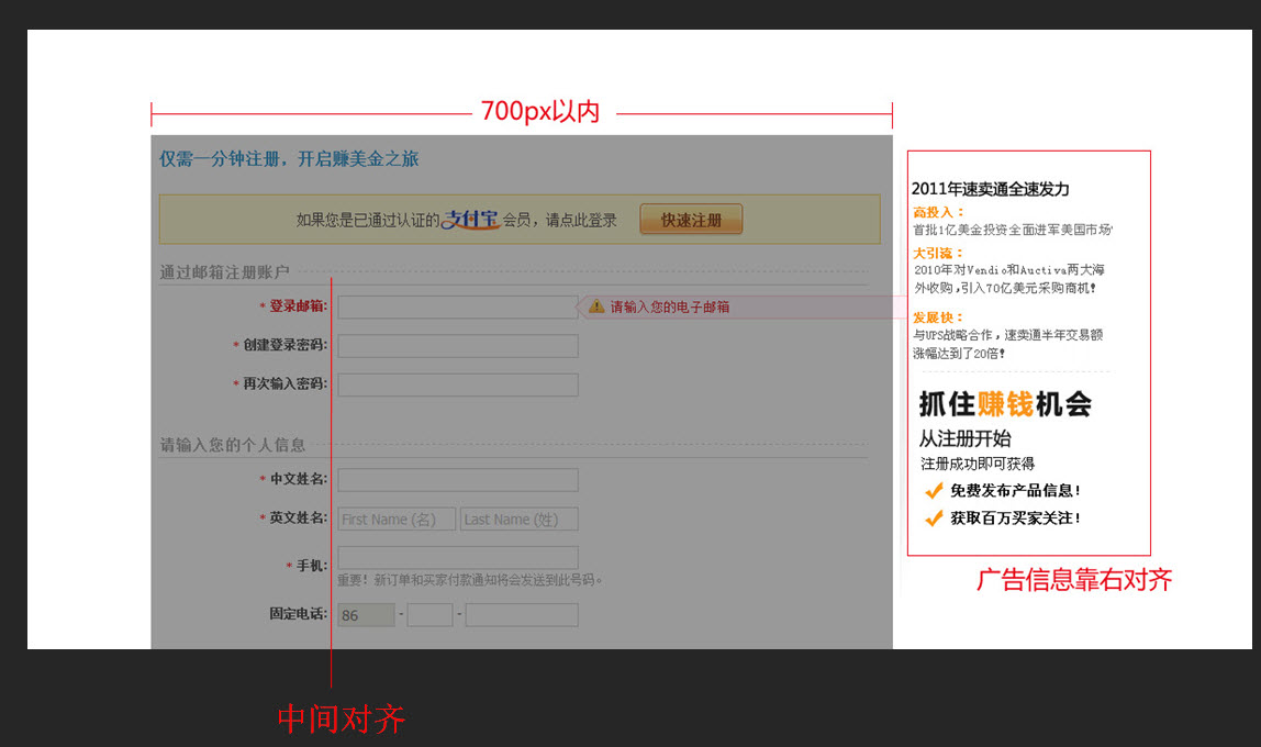 ①每项内容的填写的规格应给予明确的提示。(提示包括让用户填写的理由,比如我为什么要你的手机号;填写的范例 e.g.)