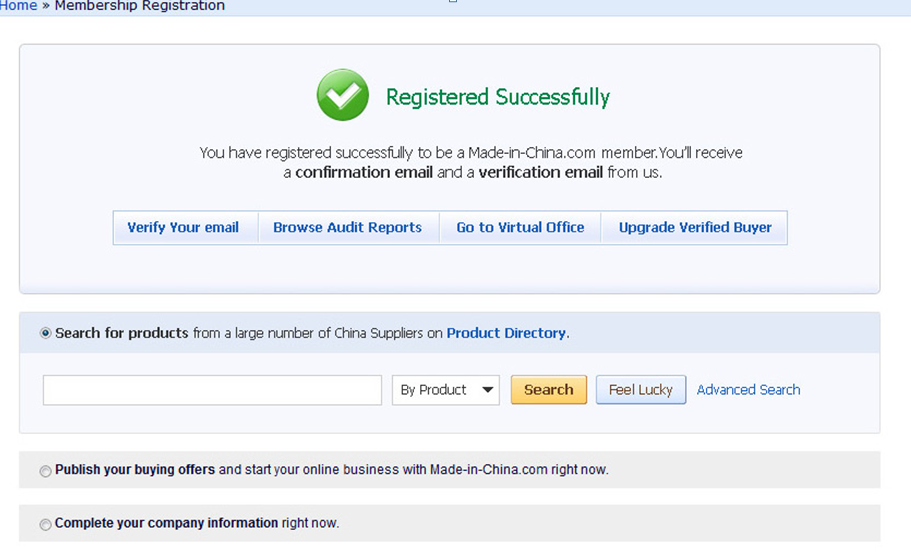 ④注册成功后,需要”夸奖“一下用户,并告诉用户下一步可以干嘛。(如果让我写文案,我要模仿数字公司的安全检测—-恭喜你!你已成功打败了19999的火星用户,注册成功了 !下面你可以去发布产品或者继续完善公司资料)