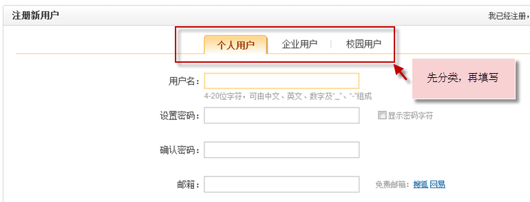 1.填写帐号资料。主要包括:帐号,密码,邮箱,协议。