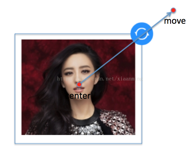 计算缩放比例比较简单,使用手指移动的点到图片所在中心点的距离除以图片对角线的一半就是缩放比例了,接下来就计算旋转角度,如下图