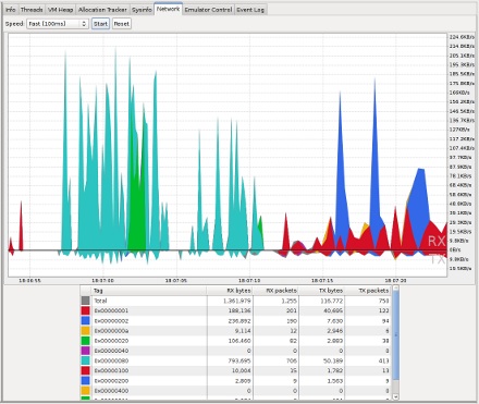 想要知道我们的应用程序中网络请求发生的时间,每次请求的数据量等等信息,可以通过Android Studio中的Networking Traffic Tool来查看详细的数据,如下图所示: